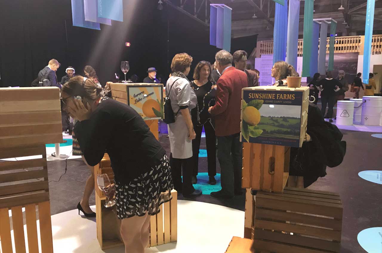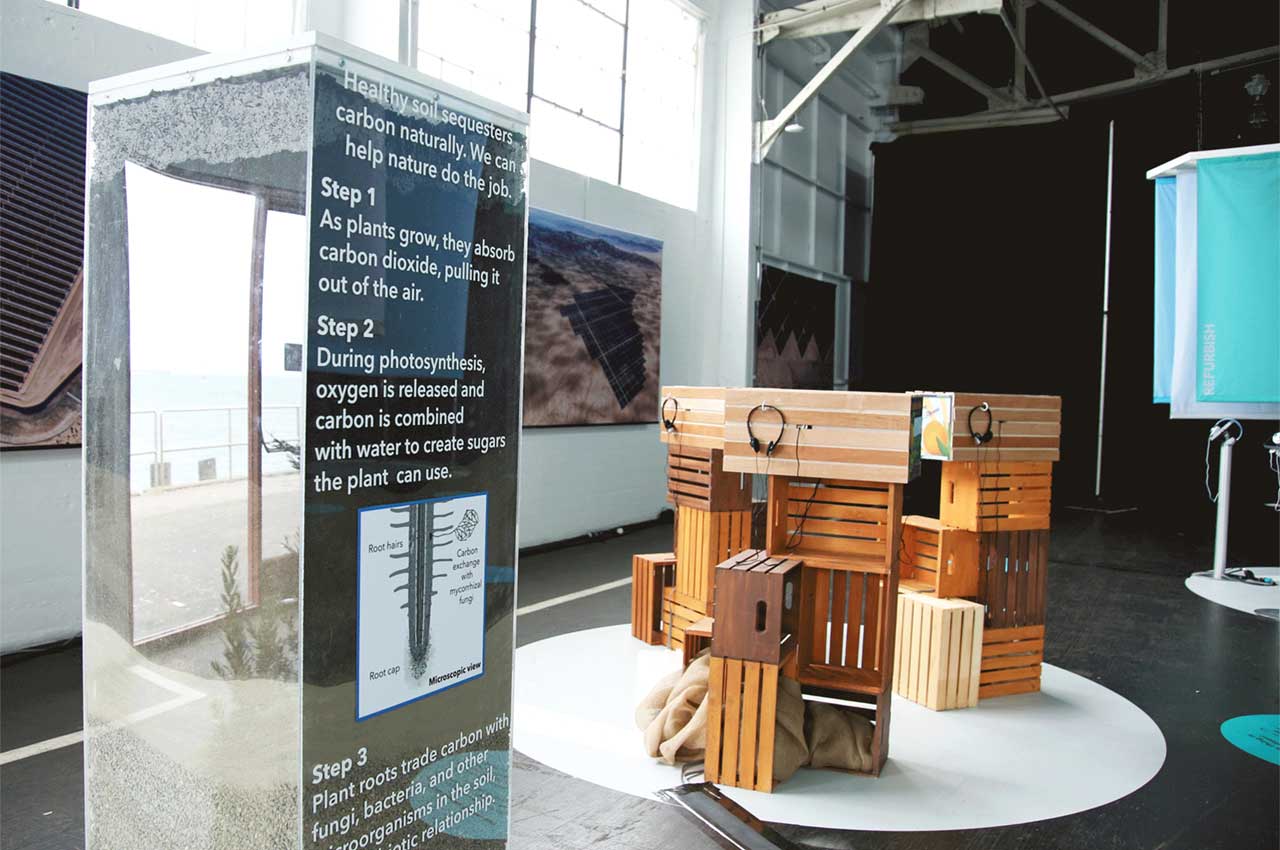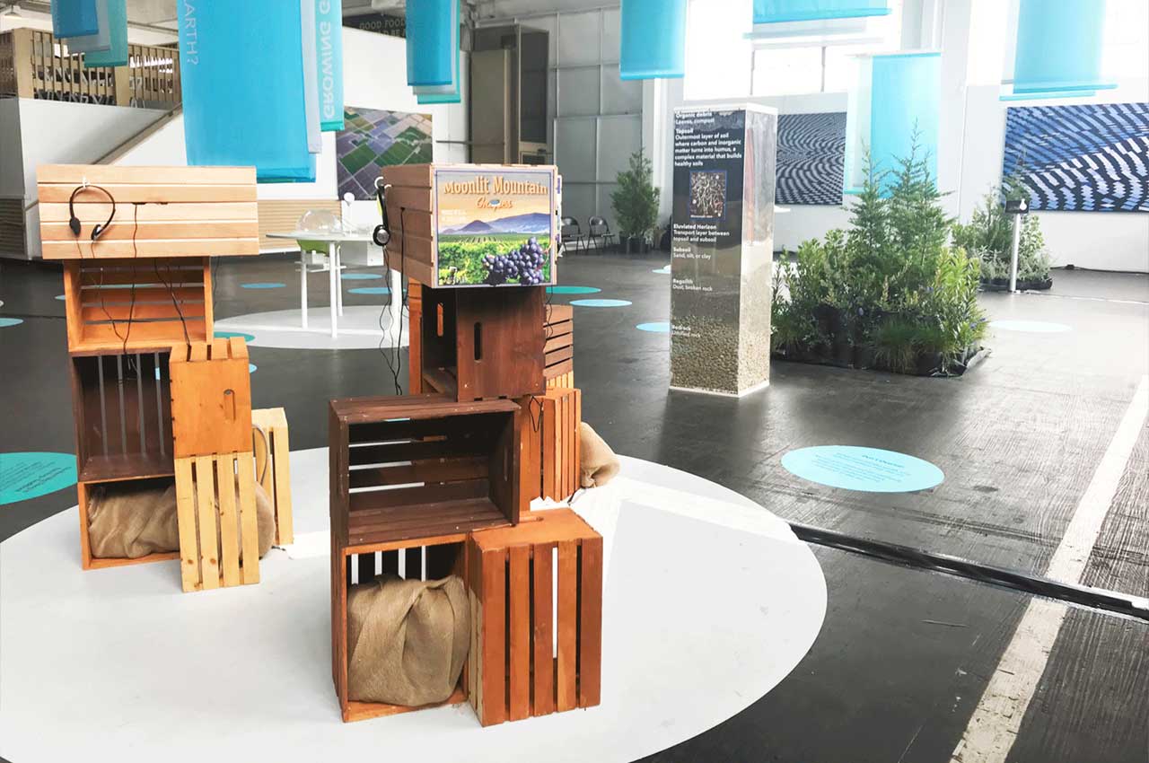Video and soil sculpture that shows how regenerative agriculture and carbon farming build healthy soil, reduce the need for petroleum-based fertilizers, and fight global warming. Visitors can watch videos from Kiss the Ground and 4 per 1000 through peepholes on fruit crates, which graphically represent conventional agriculture. A six-foot tall soil sculpture show how plant, fungi, and soil sequester carbon.