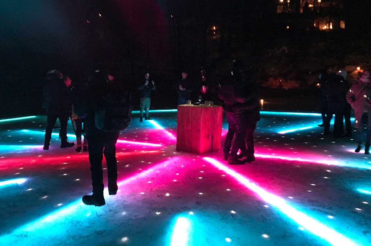As a freelance designer/technician on this project, I collaborated with the team at MODAL to design, prototype, test, assemble, program, install, and de-install the LED system within ice. I drew the initial shape of the dance floor taking into consideration the length of the silicon LED tape, light fall off, and maximal area. Here are some videos of the dancing and ice skating.