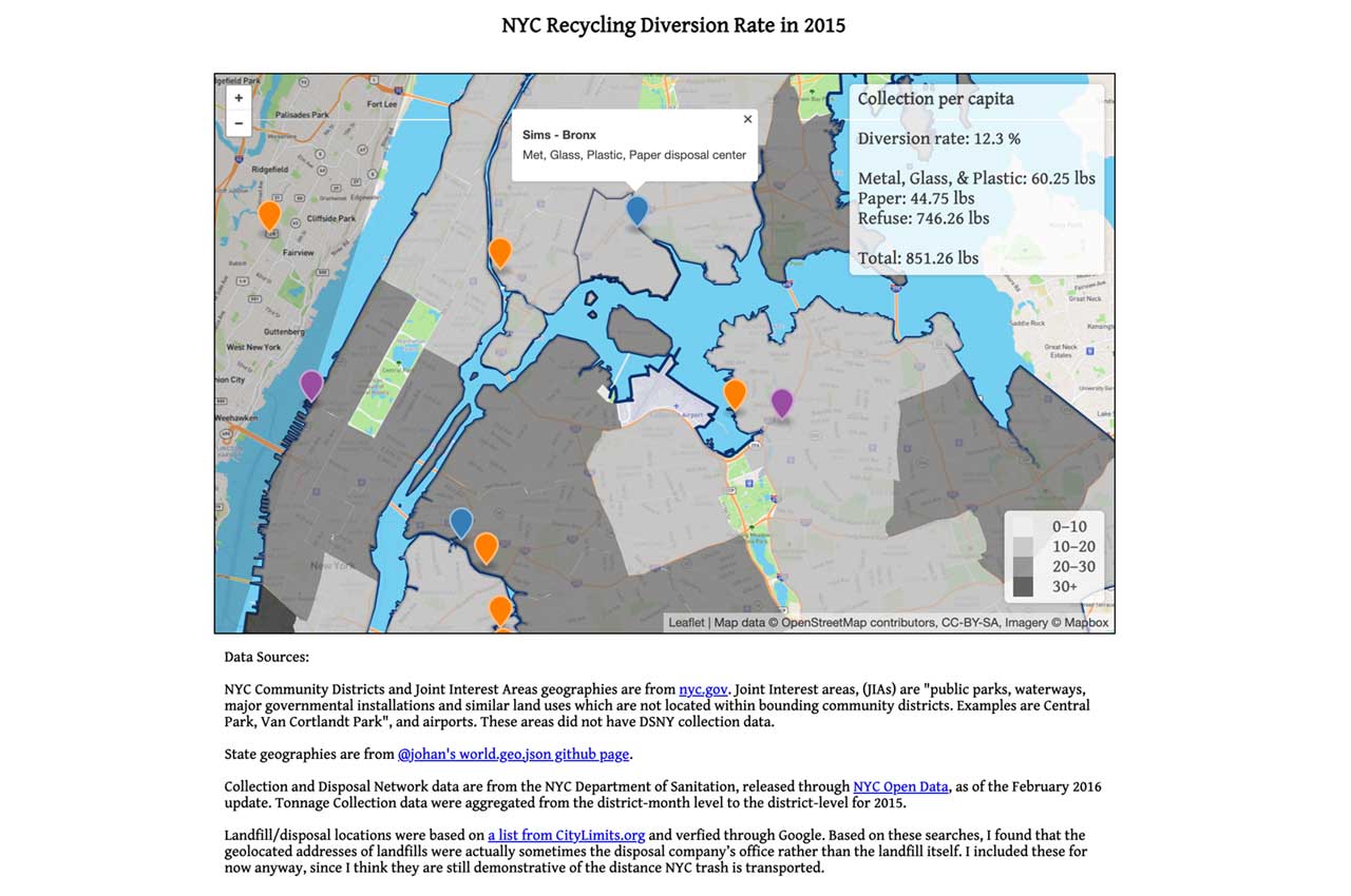 A map of official residential recycling rates by NYC community district, location of waste processing facilities, and landfill destinations, using data from 2015. For now the map lives here.